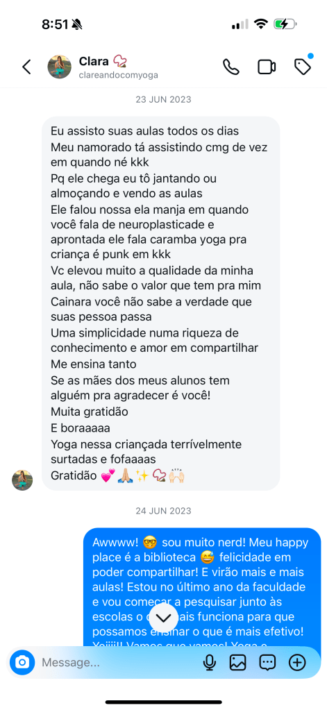 Hoje ensino Yoga para crianças de diversas idades, mas também guio pessoas, como você, na jornada de se tornarem professoras. Com centenas de alunas, o Yoga Quest ensina o que há de mais efetivo, mágico e transformador nessa união entre ciência, alma e prática.